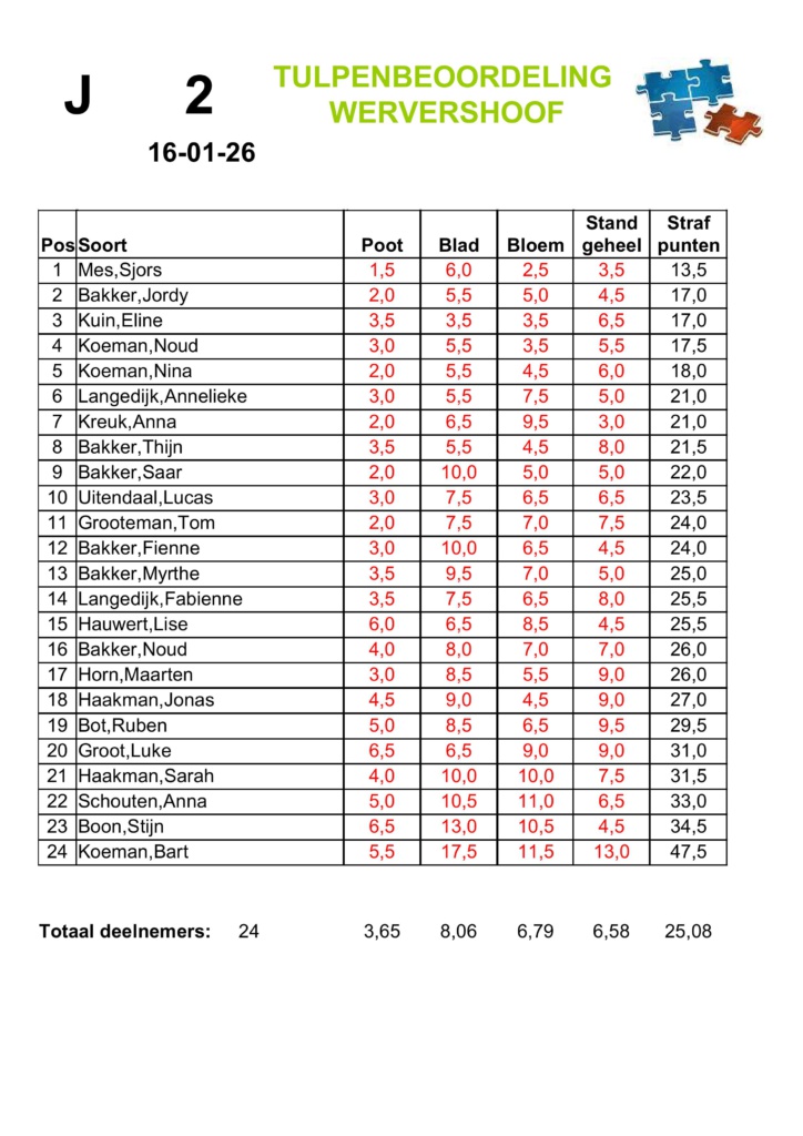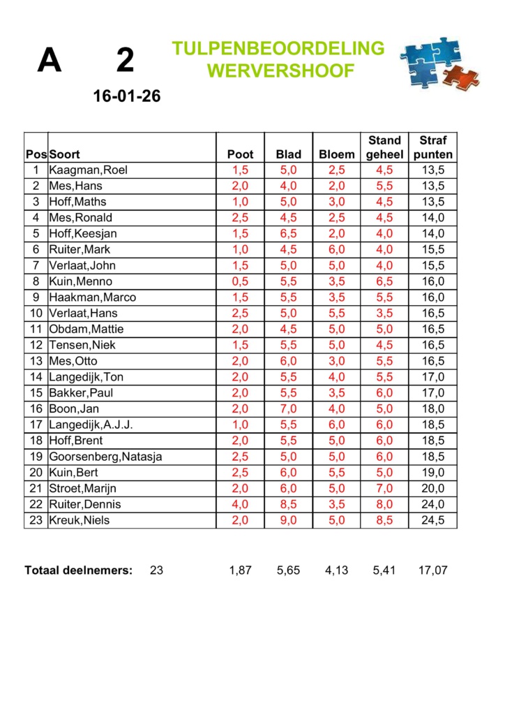Afgelopen vrijdag stond de tweede tulpenkeuring op het programma. Normaliter vallen de topscores in de A-groep en dus niet in de B-groep. Echter, deze avond spotte Marco Hoff met deze wetten. Hij zette vanuit de B-groep een topscore neer van slechts 10,5 strafpunten. Hiermee was hij veruit de beste van alle keurders. De winnaars van de A-groep waren Hans Mes, Maths Hoff en Roel Kaagman, allen met 13,5 strafpunten. Hiermee konden ze bij lange na dus niet tippen aan de score van Marco Hoff.