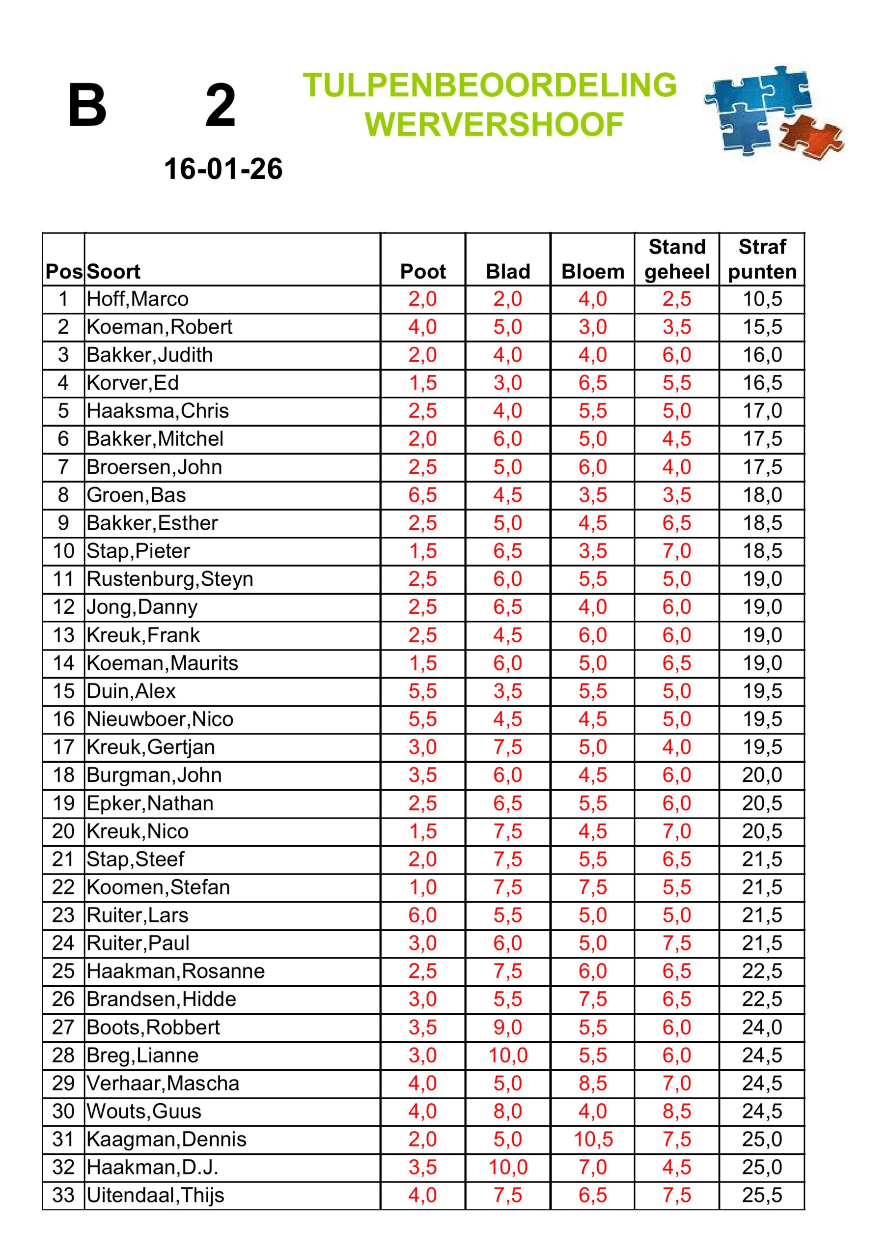 Afgelopen vrijdag stond de tweede tulpenkeuring op het programma. Normaliter vallen de topscores in de A-groep en dus niet in de B-groep. Echter, deze avond spotte Marco Hoff met deze wetten. Hij zette vanuit de B-groep een topscore neer van slechts 10,5 strafpunten. Hiermee was hij veruit de beste van alle keurders. De winnaars van de A-groep waren Hans Mes, Maths Hoff en Roel Kaagman, allen met 13,5 strafpunten. Hiermee konden ze bij lange na dus niet tippen aan de score van Marco Hoff.